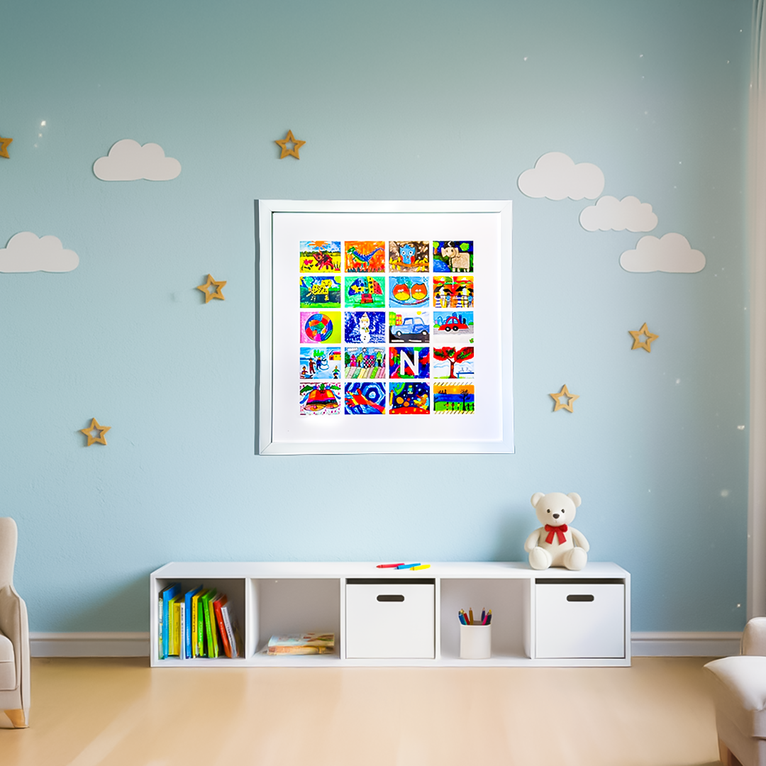 We preserve your child’s artwork by professionally photographing and blending multiple pieces into a stunning collage-style mosaic.